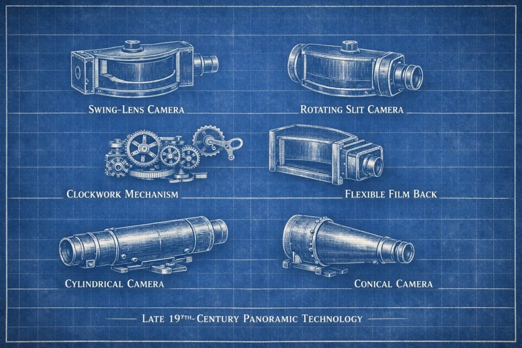 By the late 19th century, panoramic cameras were evolving rapidly. Inventors experimented with:
