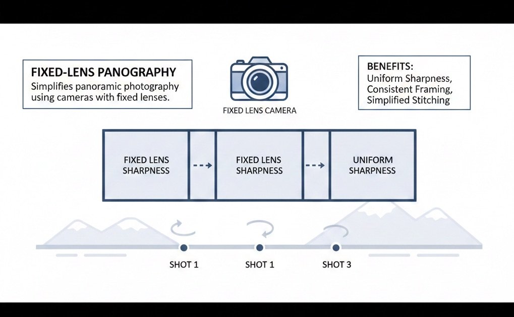 This method simplifies panoramic photography by using cameras with fixed lenses. While it limits zoom capabilities, fixed-lens photography ensures uniform sharpness and framing.