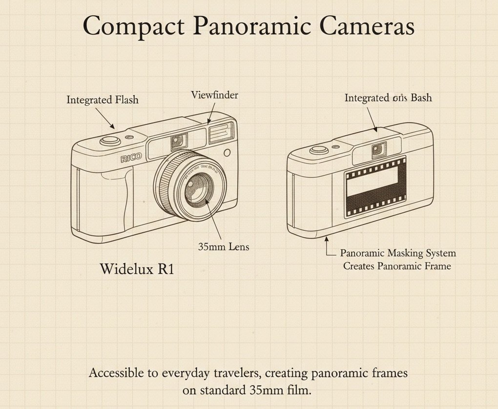 By the late 20th century, compact panoramic cameras made wide‑format photography accessible to everyday travelers. These cameras often used masking systems to create panoramic frames on standard 35mm film.