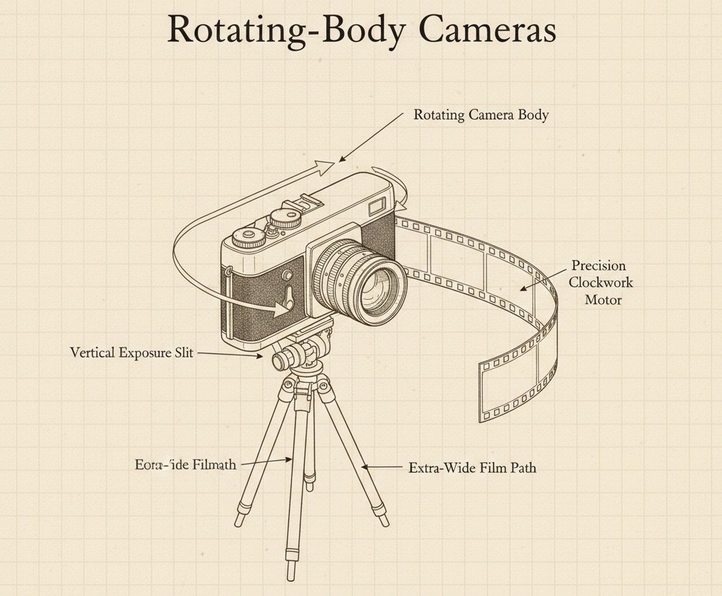 Some panoramic cameras rotated the entire body rather than just the lens. These devices produced extremely wide images, often approaching 360 degrees, making them ideal for documenting: