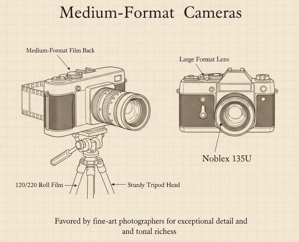Medium‑format panoramic cameras offered exceptional detail and tonal richness. They were favored by fine‑art photographers who wanted to capture the world with clarity and depth.