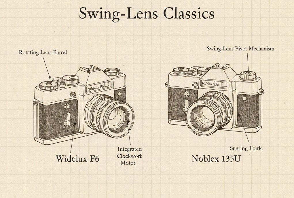 Swing‑lens cameras refined the rotating‑lens concept by allowing the lens to pivot in a controlled arc. These cameras produced images with a distinctive curved perspective — a look that many panoramic artists still admire today.